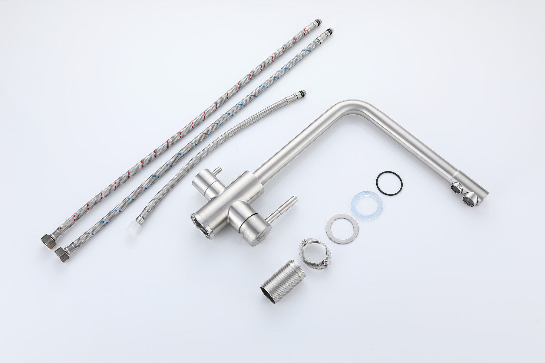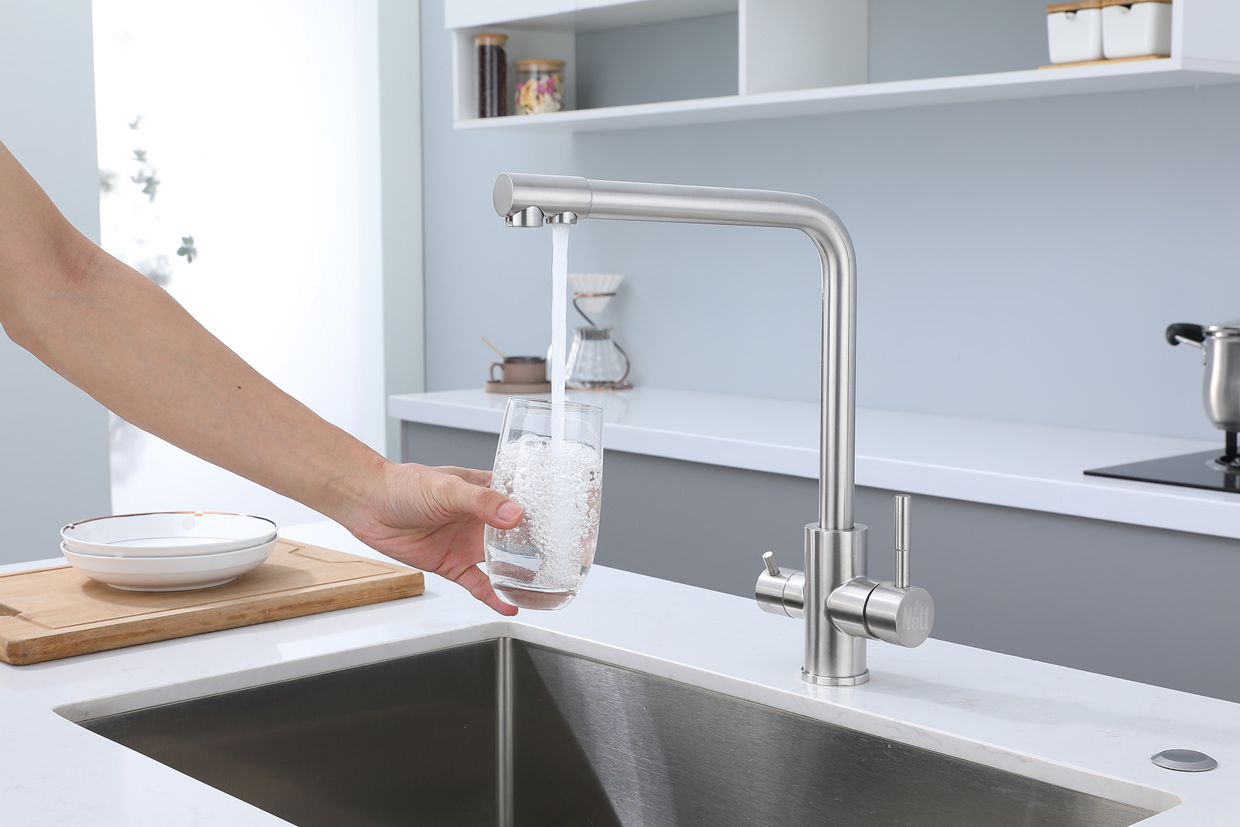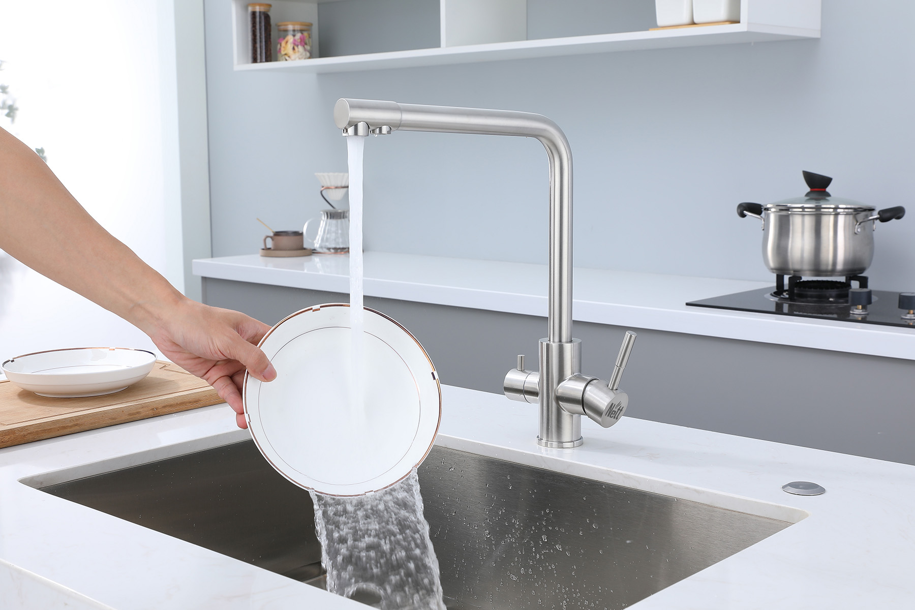1. WielofunkcyjnośćBateria trójdrożna przeznaczona jest do podłączenia do wody wodociągowej i filtrowanej. Sterowanie baterią odbywa się za pomocą dwóch uchwytów: lewy uchwyt do wody filtrowanej, prawa uchwyt do regulacji ciepłej i zimnej wody.
