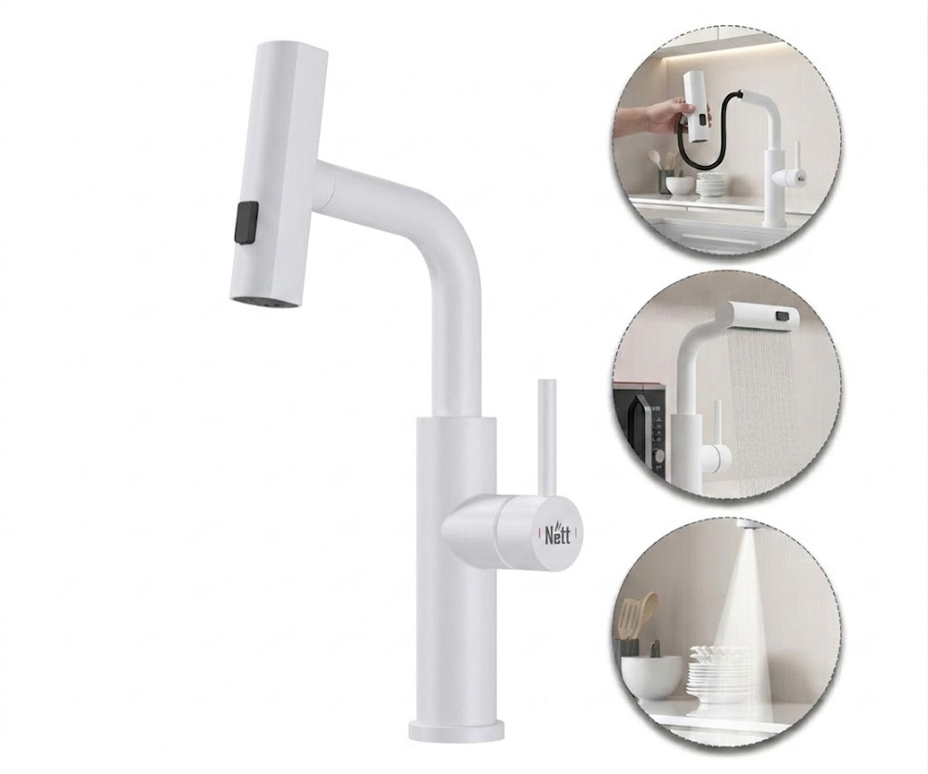 Bateria kuchenna wodospad z wyciąganą wylewką biała Nett LW-35