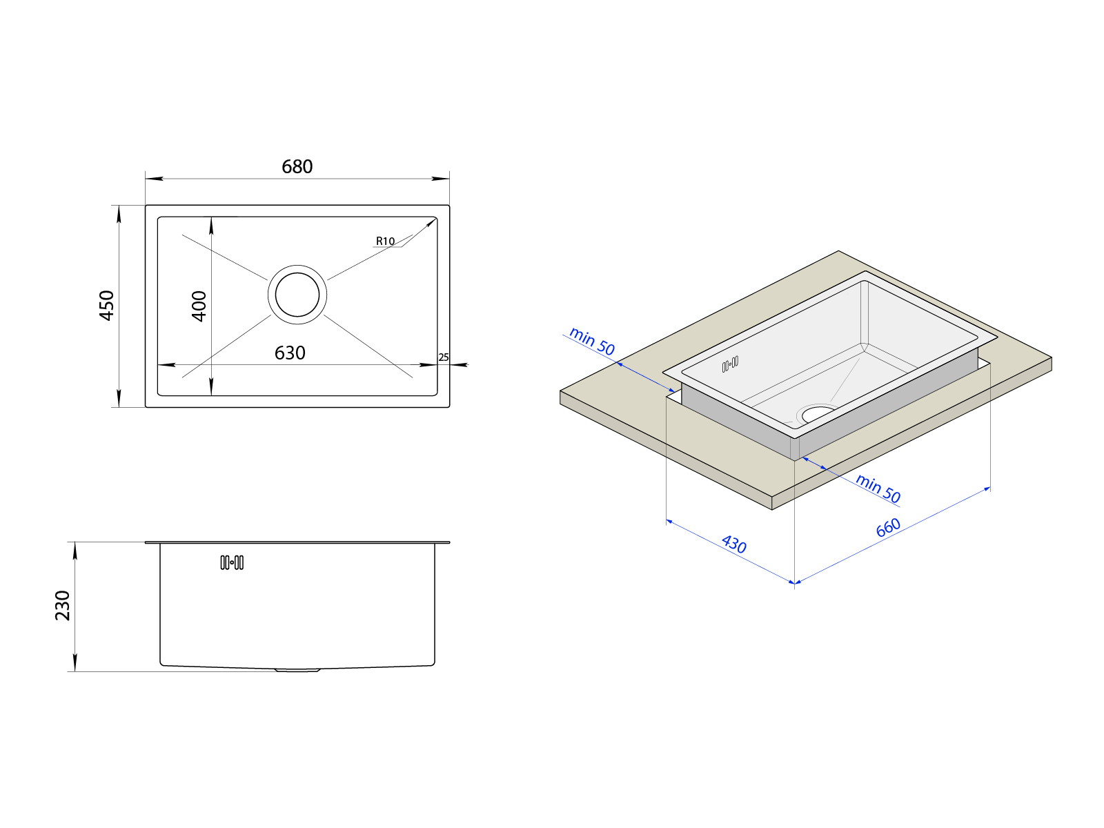 Standardowe wymiary 68*45 cm sprawiają, że zlewozmywak ten jest idealnym wyborem do każdej kuchni, umożliwiając montaż zarówno w kamiennych blatach, jak pod nimi.