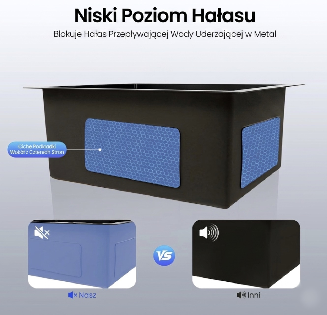 - Wyższa skuteczność redukcji hałasu niż w zlewach tłoczonych masowo