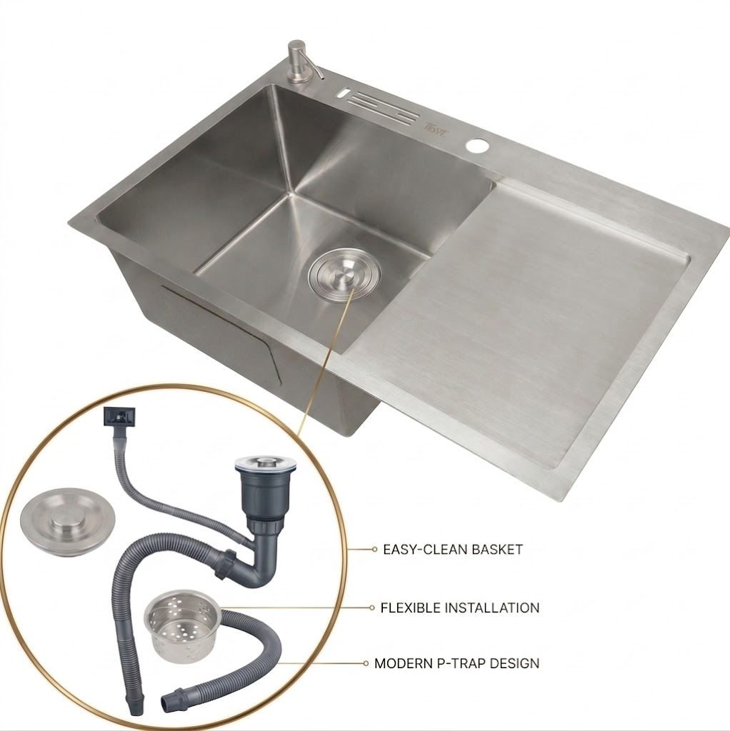 Do każdego zlewozmywaka dołączamy w prezencie syfon wykonany z tej samej stali co zlew – AISI 304. Trwały, estetyczny i dopasowany od pierwszego dnia. To realne 100 zł, które zostają w Twojej kieszeni – wszystko czego potrzebujesz znajdziesz w jednym pudełku, gotowe do montażu od razu po dostawie.
