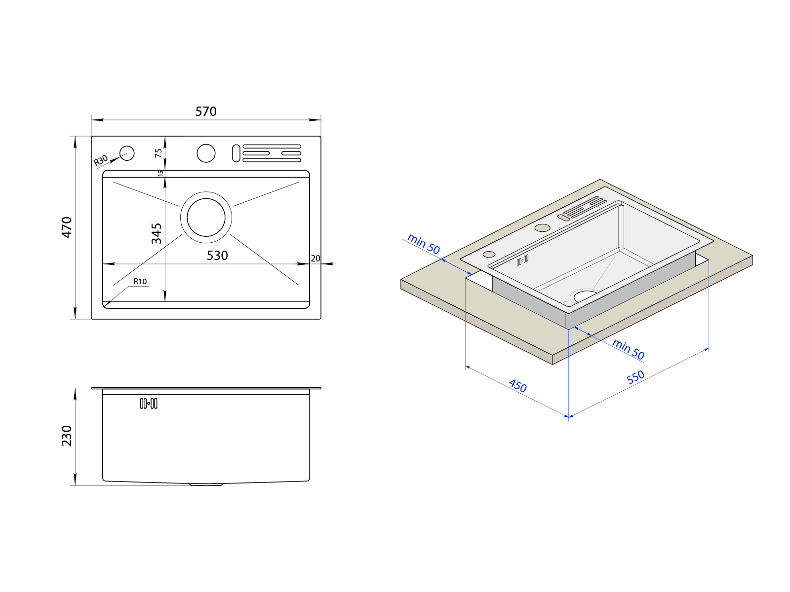 Zlewozmywak wykonany jest z najwyższej jakości stali nierdzewnej o minimalnej grubości 1,5 mm w najcieńszym miejscu i 3 mm grubości podstawowej.