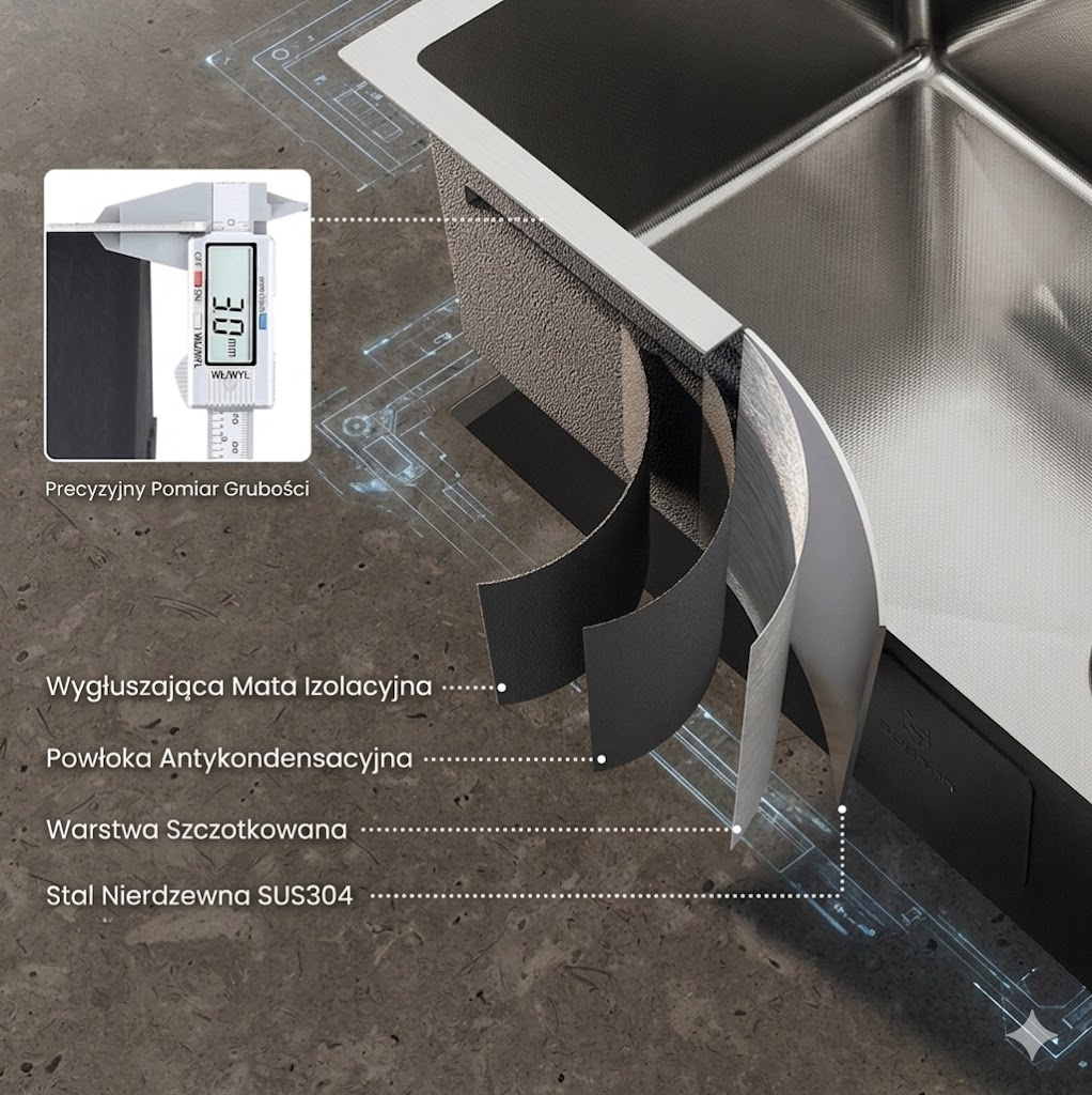Podczas gdy większość zlewozmywaków na rynku kończy na 0,8–1,0 mm, nasz model startuje od 1,5 mm w najcieńszym miejscu, a grubość podstawy sięga 3 mm. To przekłada się na wyjątkową sztywność, odporność na odkształcenia i poczucie solidności, które czujesz przy każdym użyciu – przez lata i dekady.